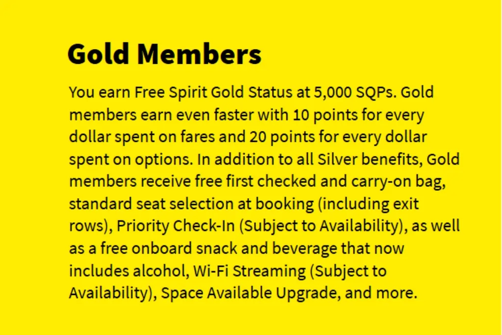 If you reach 5,000 SQPs in a year, you’ll hit Free Spirit Gold Status, the top level. Gold members get free checked and carry-on bags, free seat selection, and no change or cancellation fees. You’ll also enjoy priority service from check-in to boarding.